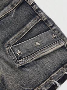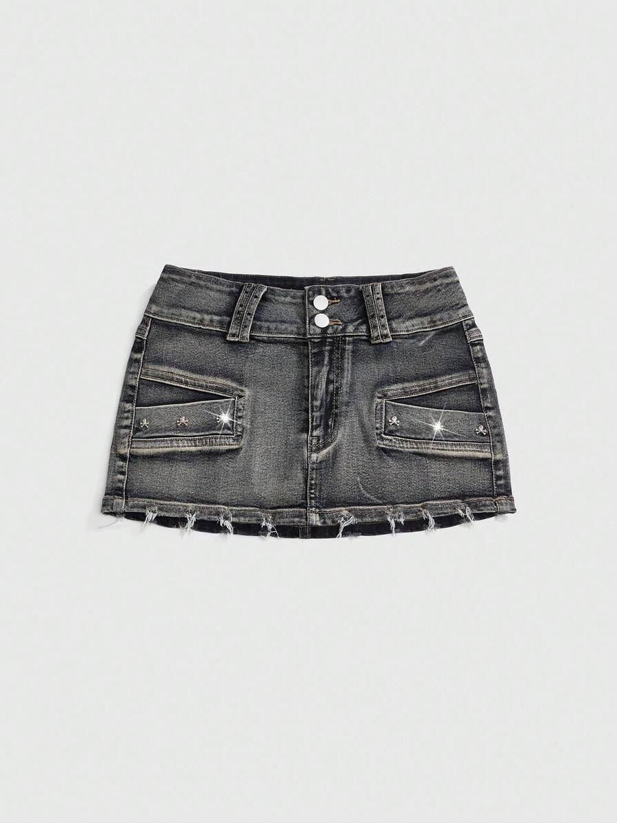 Grunge Punk Vintage Distressed Skull Studded Low Waist Sexy Denim Mini Skirt For Women