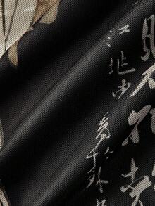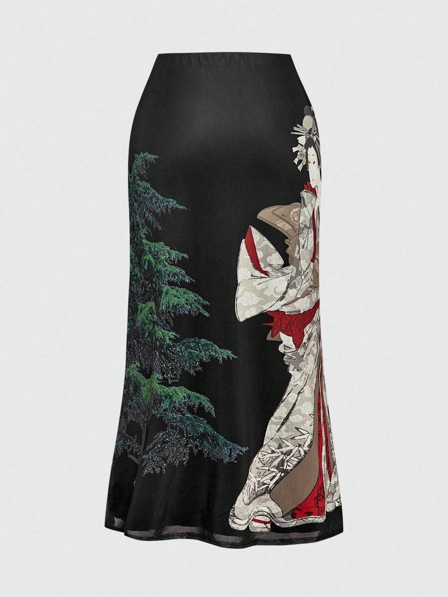 ROMWE Avant Vintage Japanese Geisha & Pine Tree Calligraphy Print Side Slit Mesh Skirt For Women