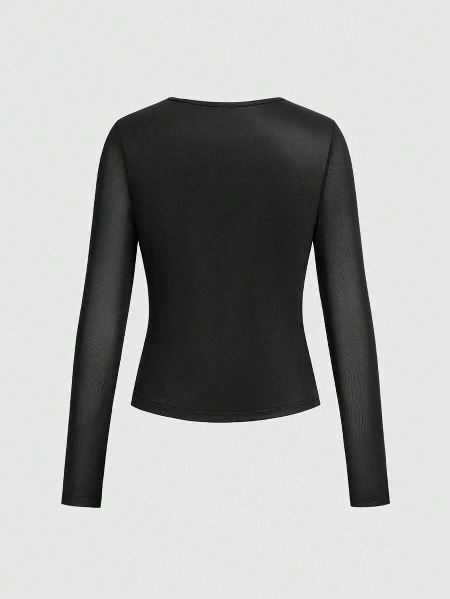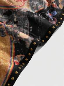 ROMWE Avant Vintage Neo-Chinese Oriental Buddha Statue Print Plunging Draped Neck Long Sleeve Top
