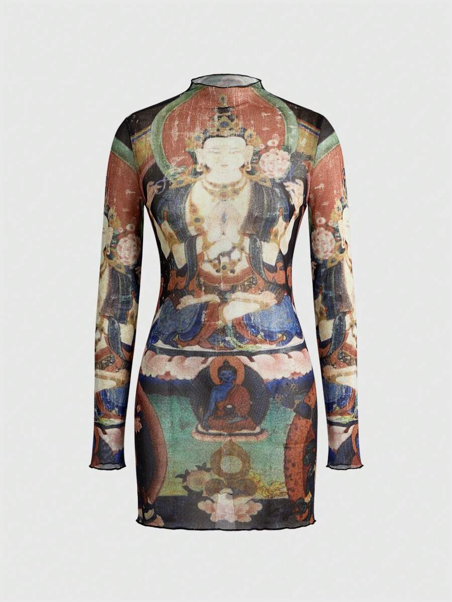 J-Fashion Vintage Religious Buddhist Print Semi-Sheer Mesh Women Short Dress
