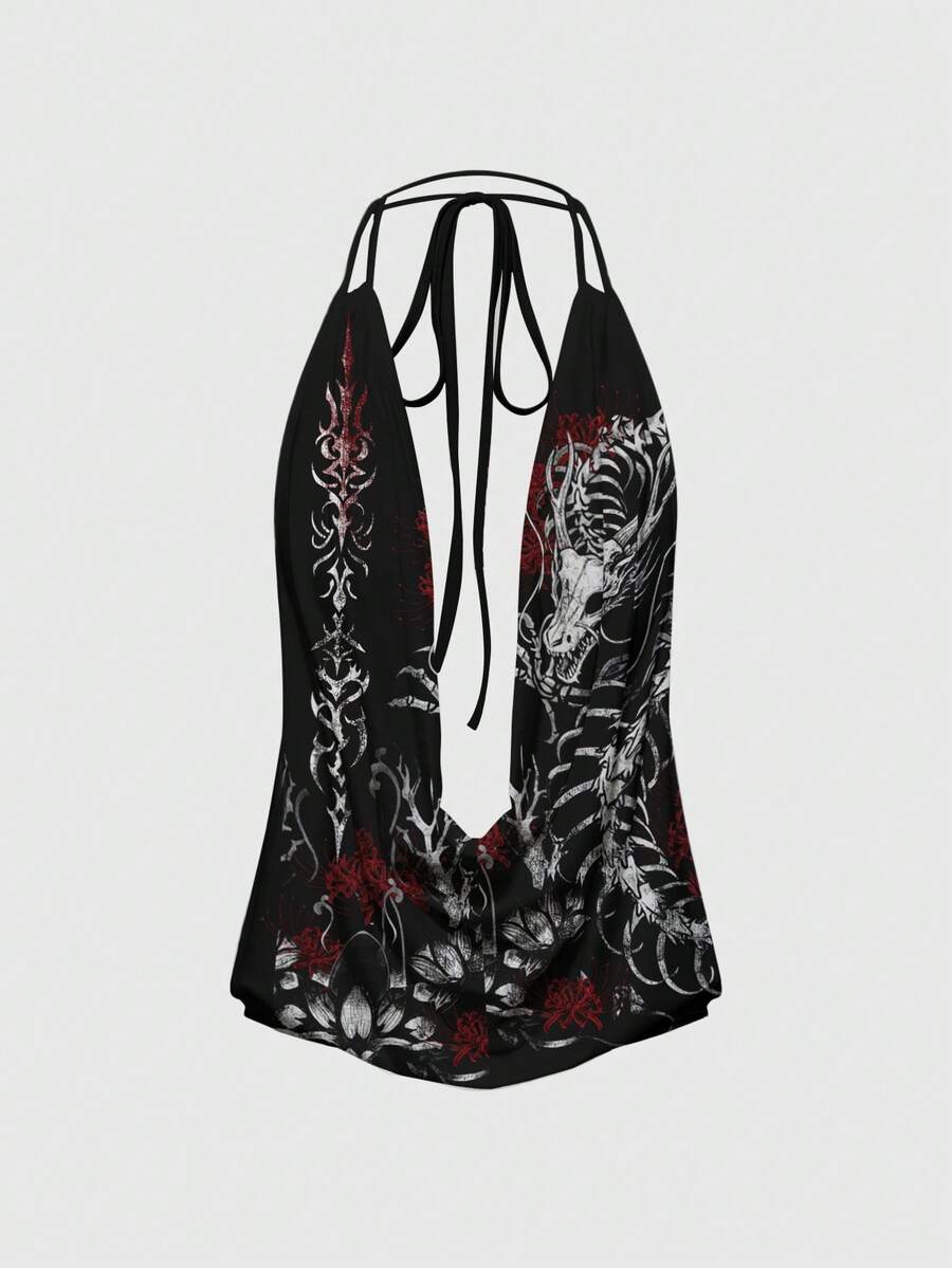 ROMWE Avant Vintage Skull Dragon & Lotus Graphic Sexy Backless Low-Cut Printed Camisole Tank Top For Plus Size Women