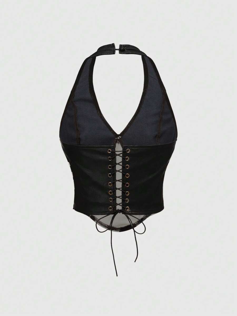 Grunge Punk Vintage Western Animal Print Patchwork PU Halter Neck Tank Top For Women