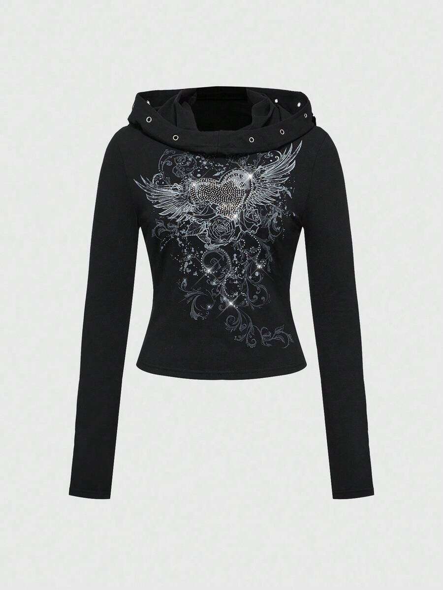 Grunge Punk Vintage Y2K Wing & Vine Heart PUNK Rhinestone Graphic Hoodie Long Sleeve T-Shirt