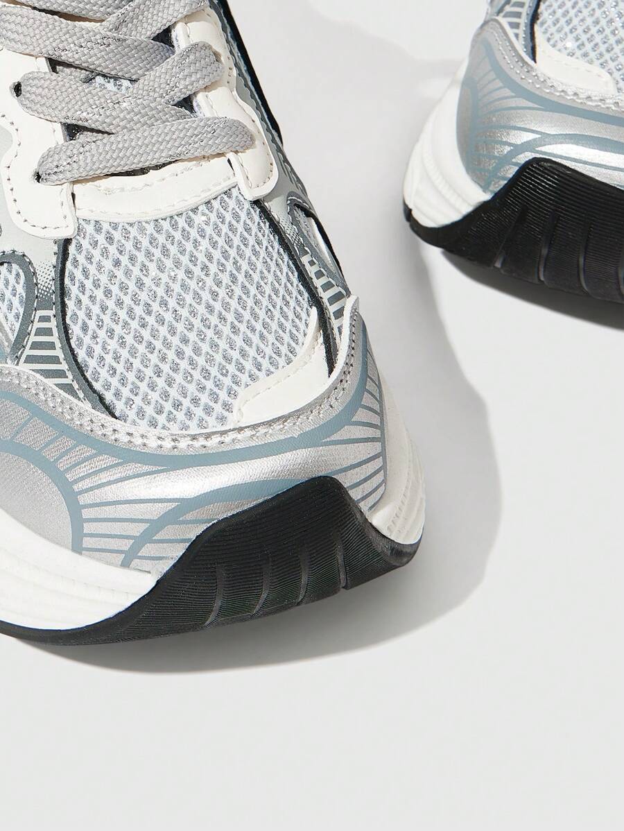 White Chunky Sneakers, Casual Sports Running Shoes, Silver Color Lightweight Comfortable Student Shoes, Women Platform & Thick Bottom Flats