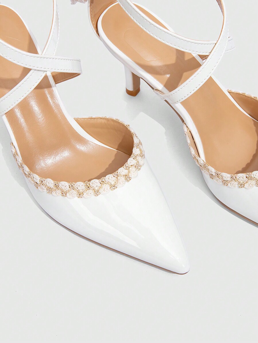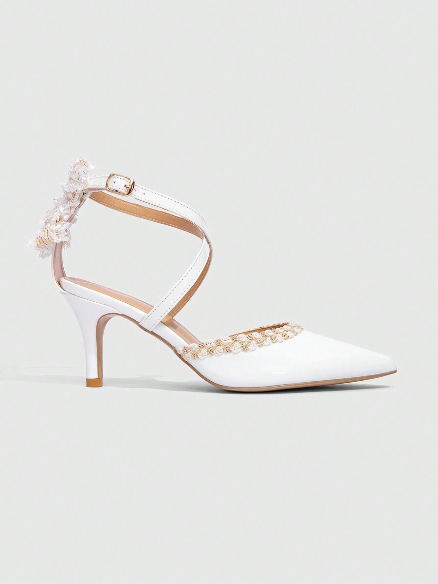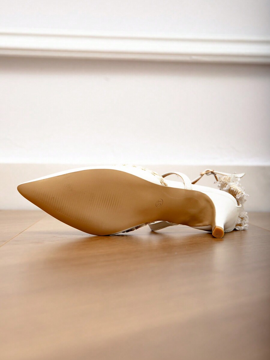 White Crystal Pointed Toe Low Heel Bowknot Strap Women Bride Wedding High Heels Shoes