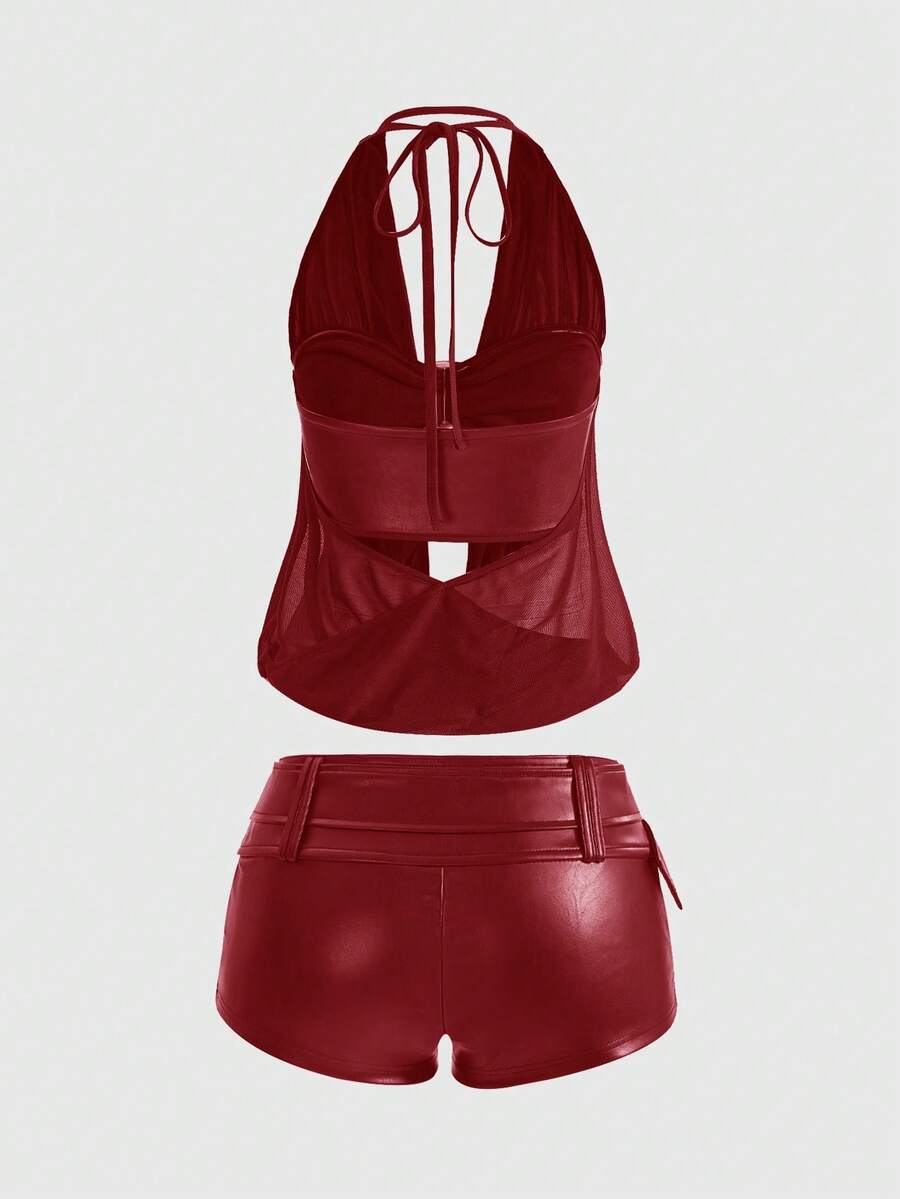 ROMWE Avant Women's Retro Gyaru Style PU Low-Waist Decorative Draped Neck Tie Crop Top And Mini Bodycon Shorts 2-Piece Set
