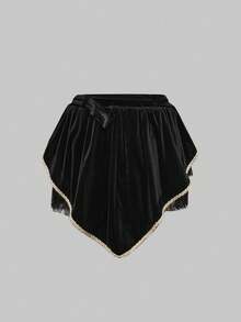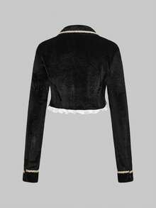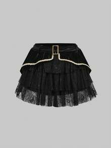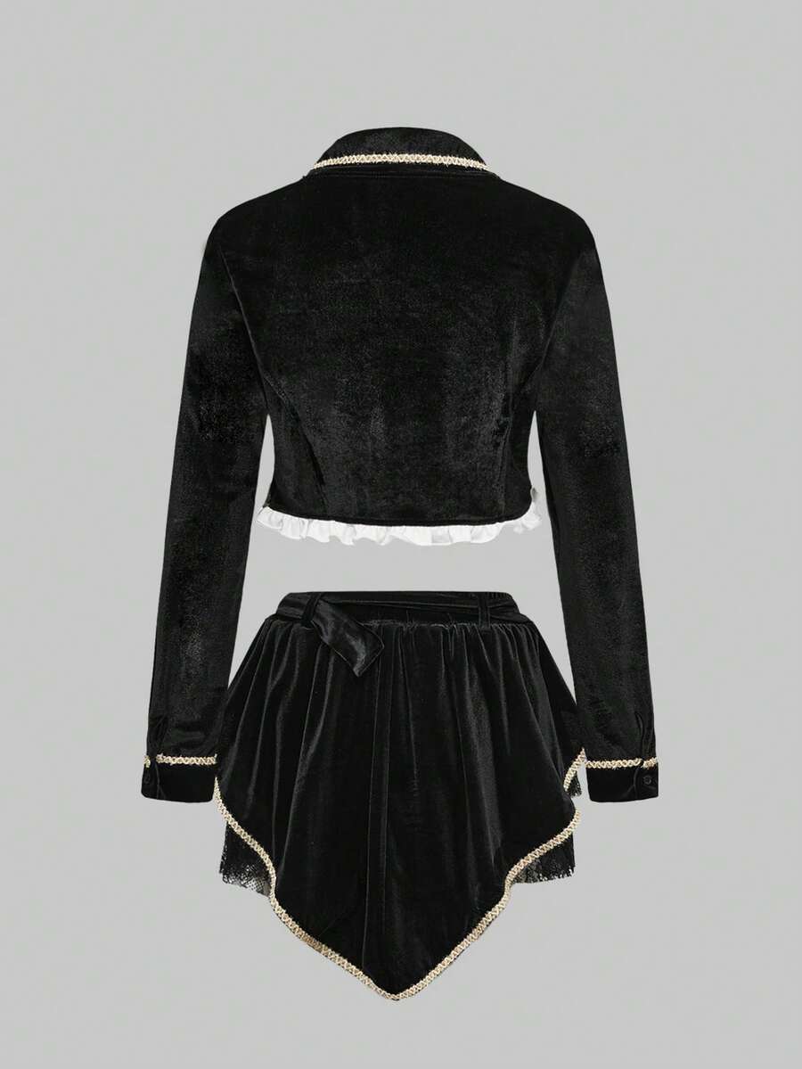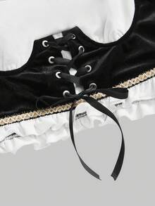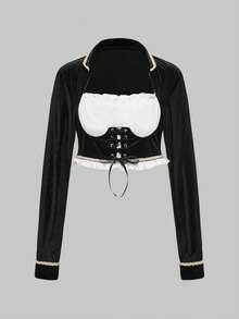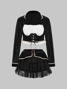 ROMWE Avant Women's Contrast Color Eyelet Lace-Up Design Long Sleeve Top And Cake Skirt Cosplay Set