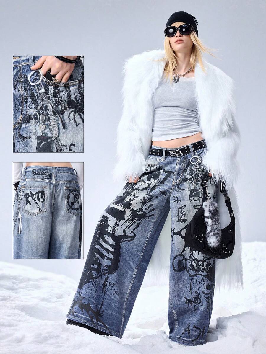 Grunge Punk Women's Dark Skeleton Print Super Low Waist Loose Fit Jeans