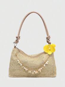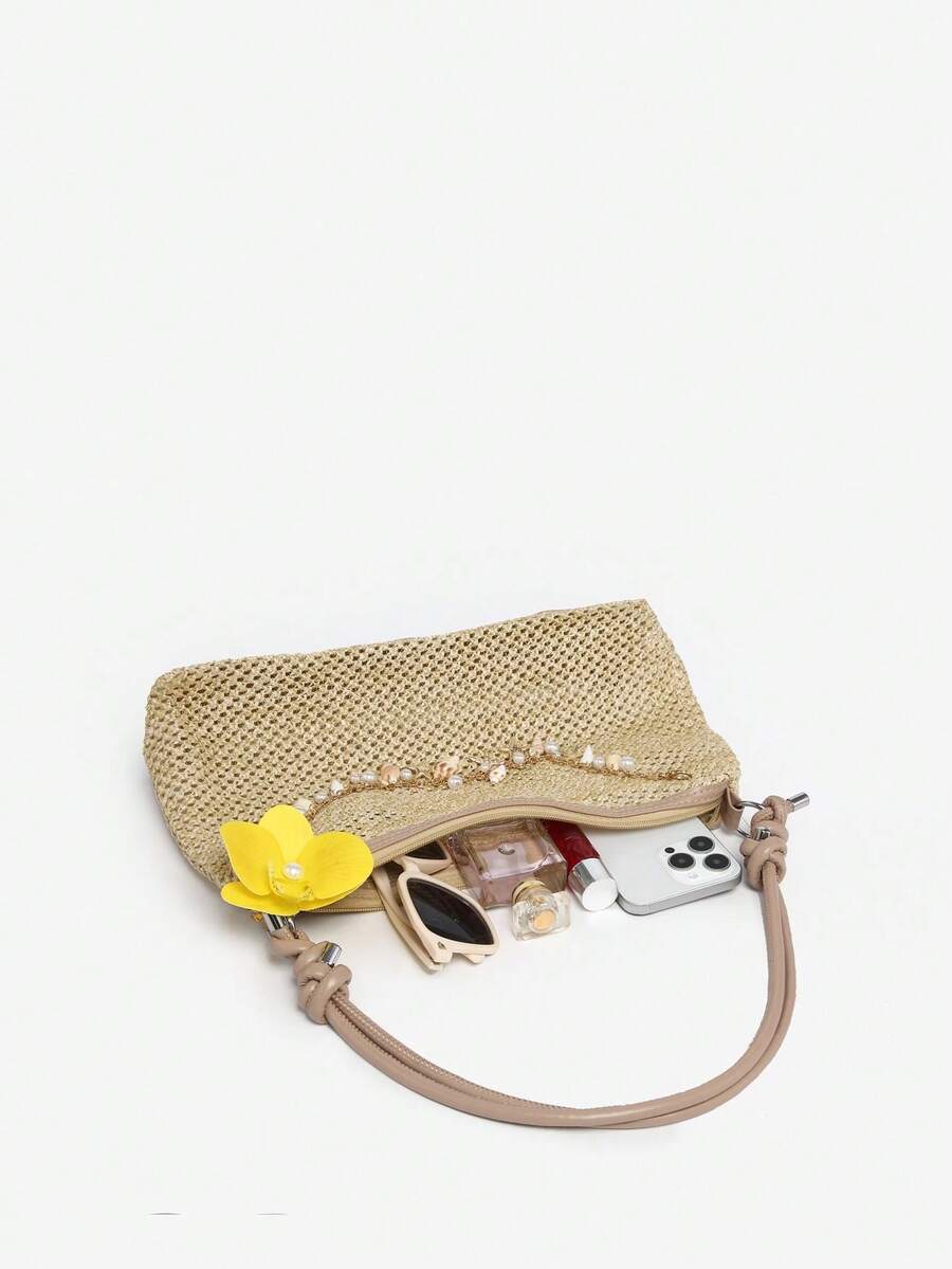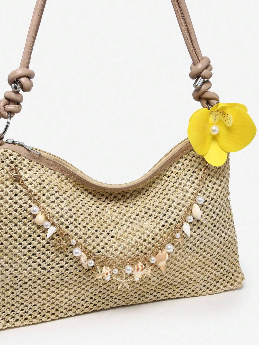 Fairycore Women's Floral Beach Straw Crossbody Bag Seashell Decor Casual Large Capacity Shoulder Bag, Suitable For Travel And Shopping