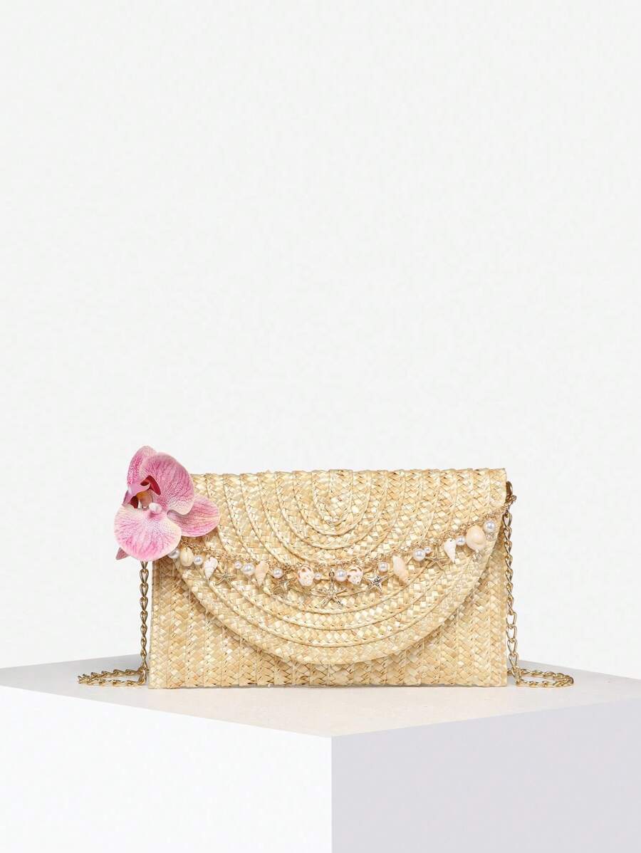 Fairycore Women's Floral Straw Shoulder Bag, Shell Shape Decor Ocean Theme Lightweight Crossbody Bag For Beach Holiday And Shopping