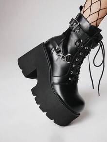 Grunge Punk Women's Solid Color Leather Punk Style Thick Heel Short Boots, Gothic Sexy Waterproof Platform Metal Double Buckle Decor Comfortable Fashion Wedge Ankle Boots