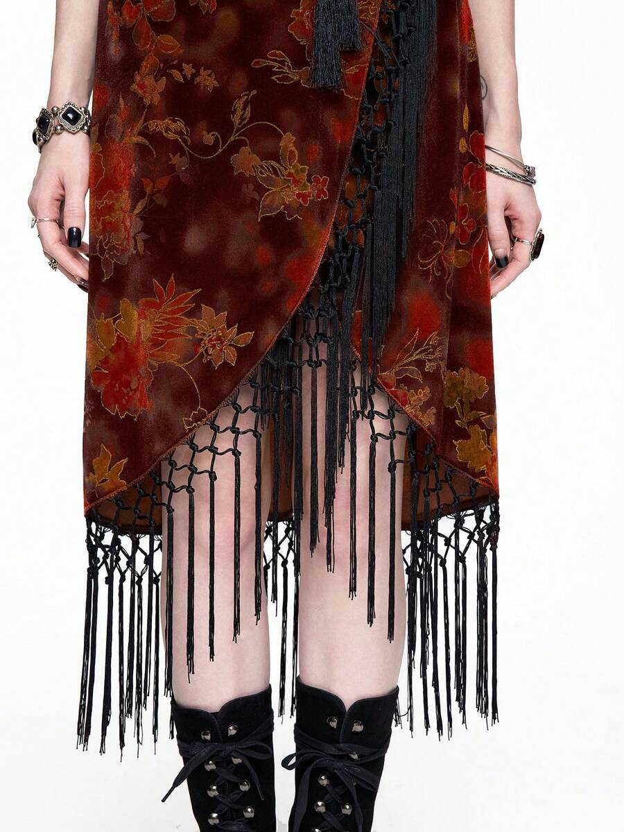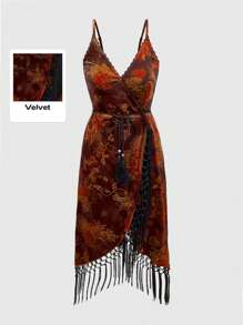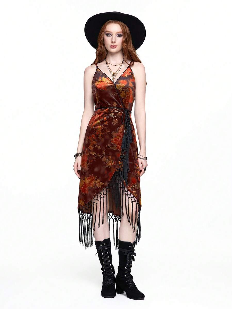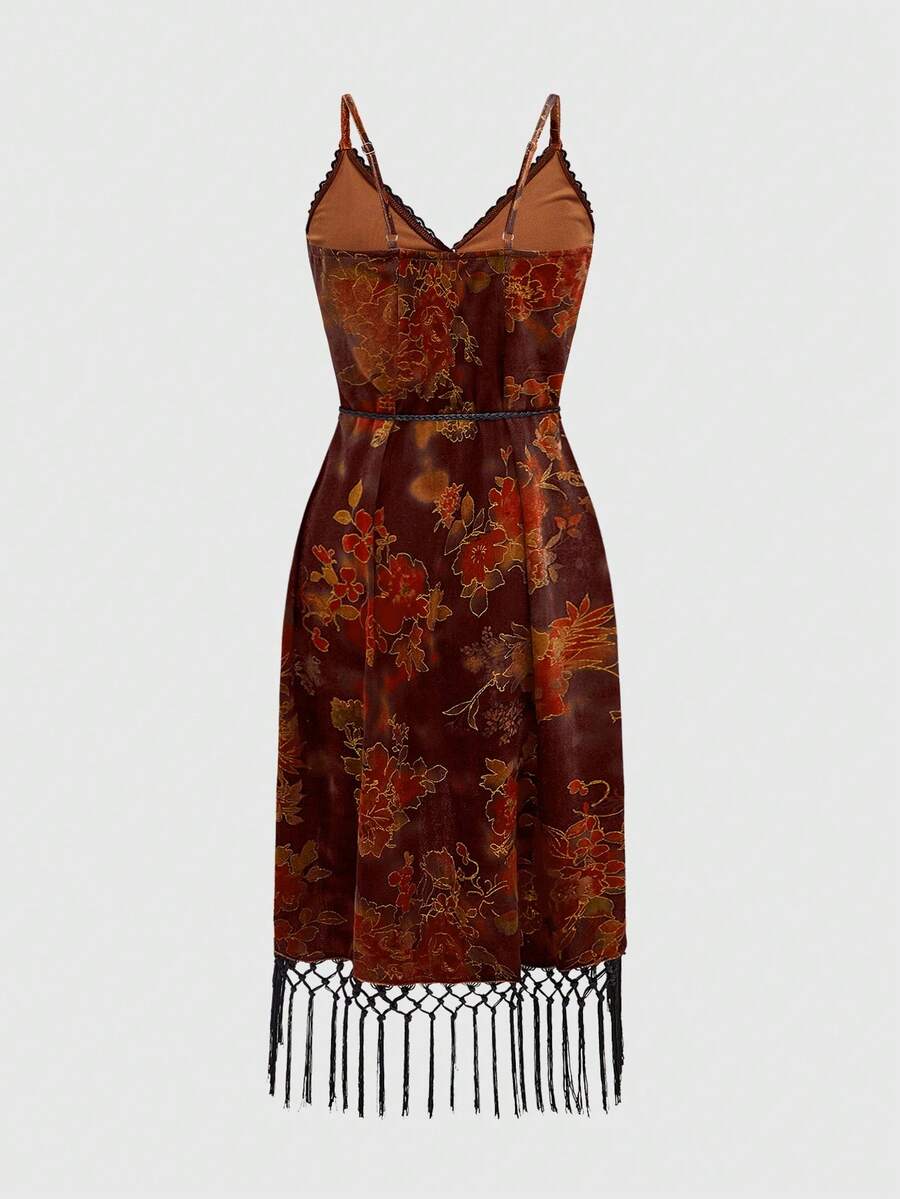 Hippie Women's Spaghetti Strap Floral Print Vintage Style Dress With Tassel Trim
