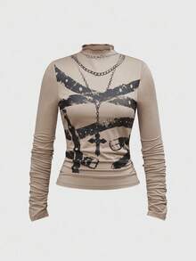 Grunge Punk Women's Wasteland PUNK Style Turtleneck Long Sleeve Pleated Print Blouse