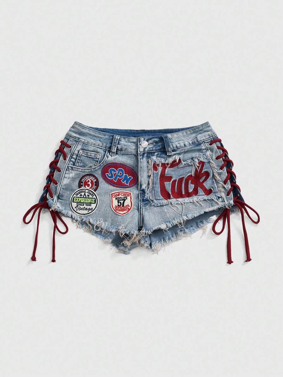 ROMWE Avant Women's Y2K Retro Jersey Sports Ballet Style Graphic Logo Embroidered Drawstring Low Waist Sexy Mini Denim Shorts