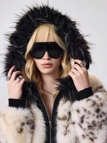 EDITION Women's Y2K Retro Subculture Colorblock Leopard Faux Fur Hoodie Oversized Basic Jacket