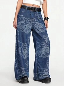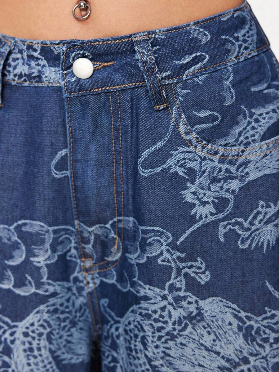 Grunge Punk Women's Y2K Vintage Dragon Print Denim Jeans