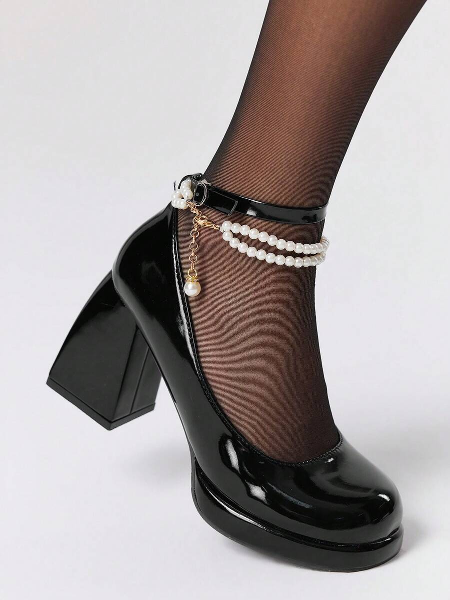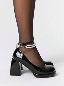 Women Black Closed Toe Chunky Heel Formal Shoes, Strap With Faux Pearl Decor Mary Jane Pumps, Waterproof Platform Office High Heels