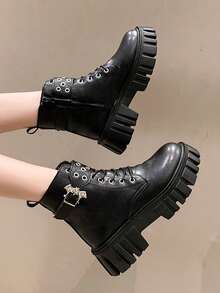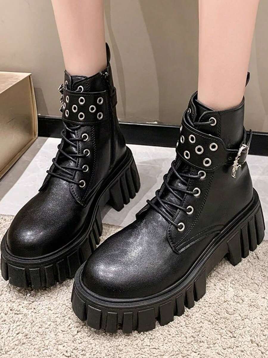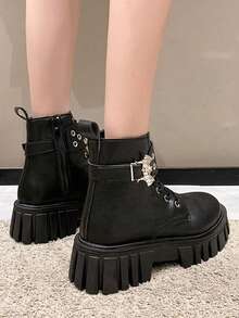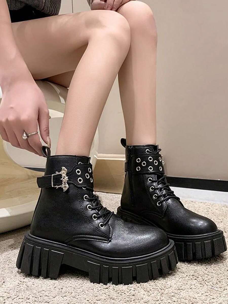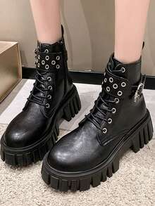 Women Buckle Decor Lace Up Front Round Toe Combat Boots, Punk Outdoor Fashion Boots