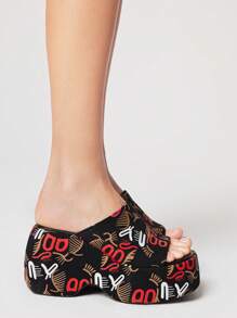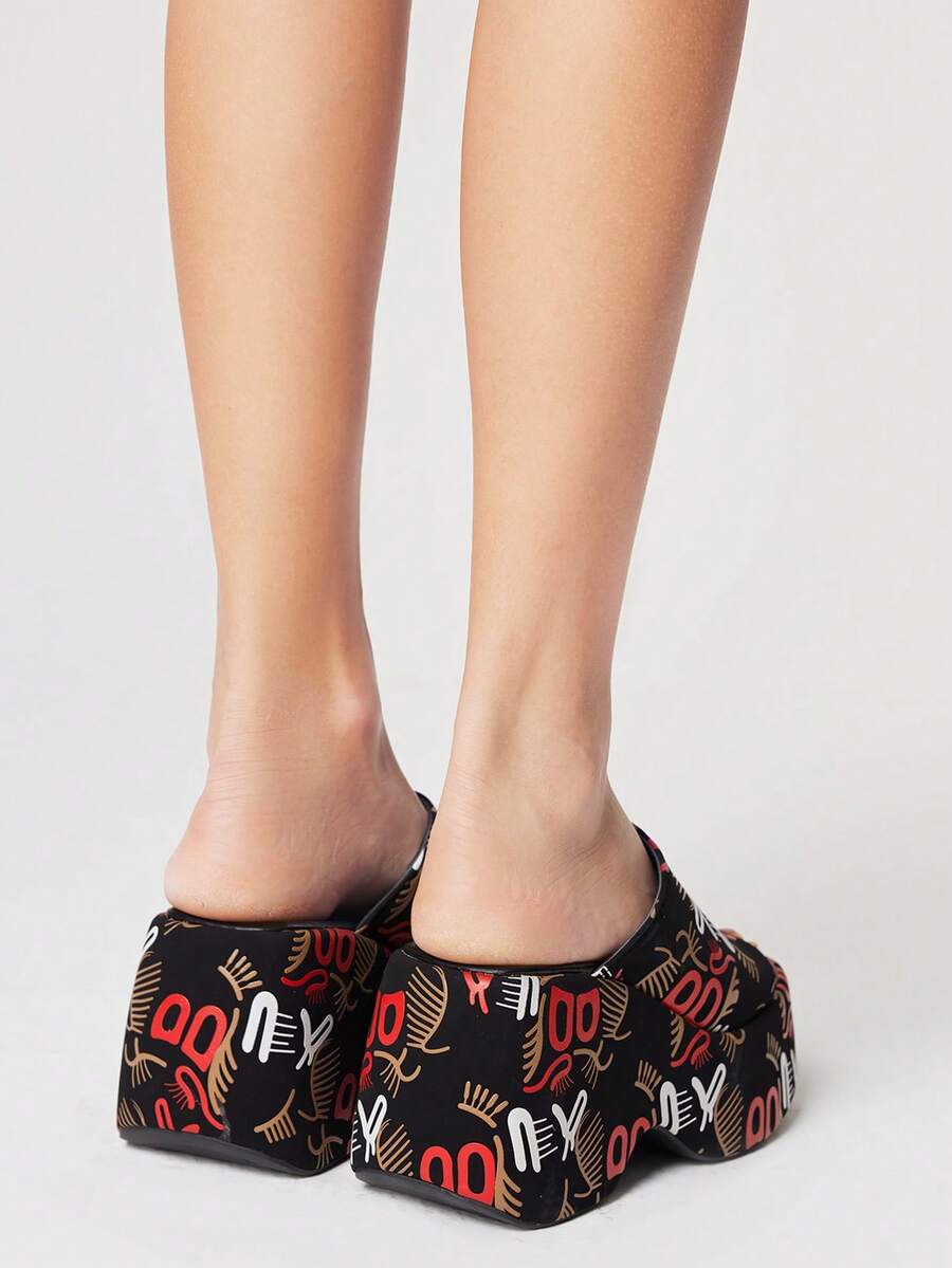 Women Gothic Style Print Black Square Toe Platform Slip-On Sandals, Halloween