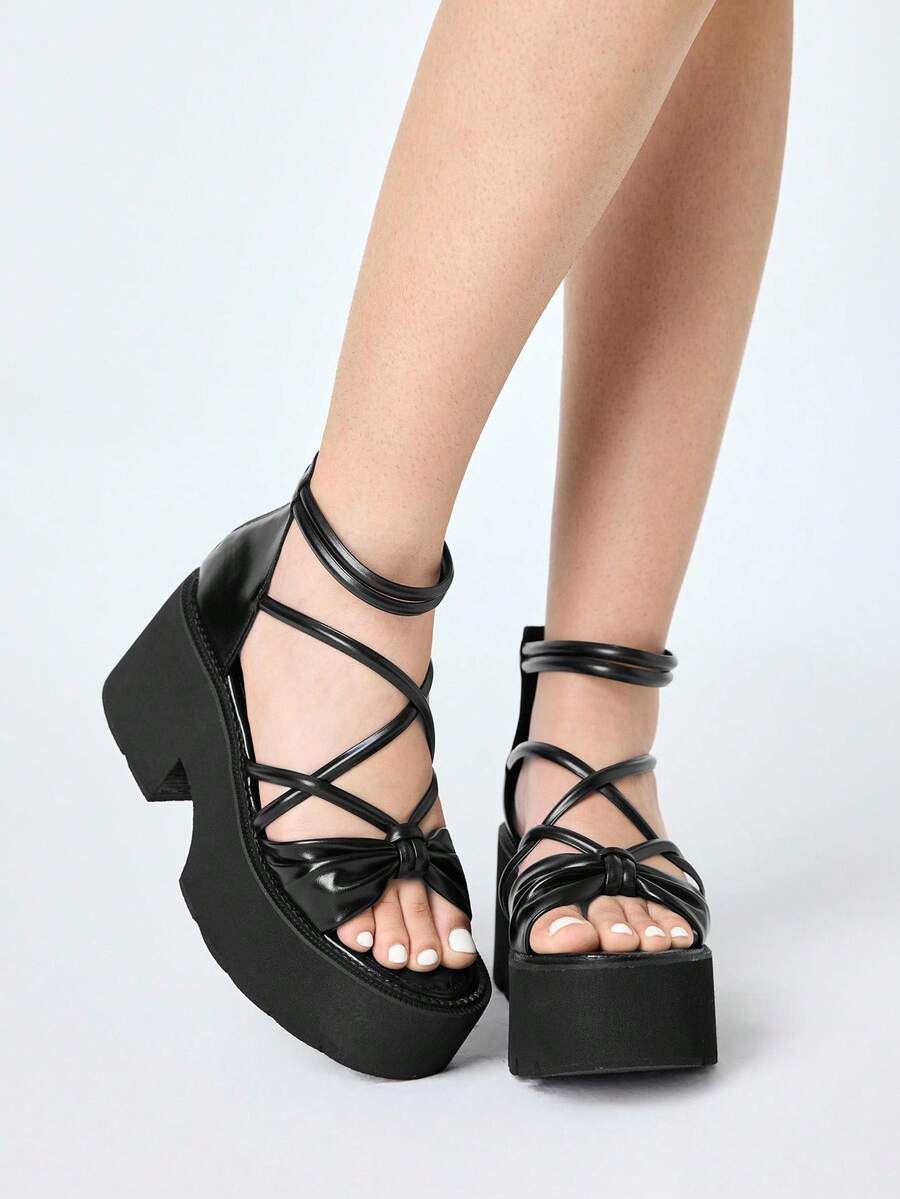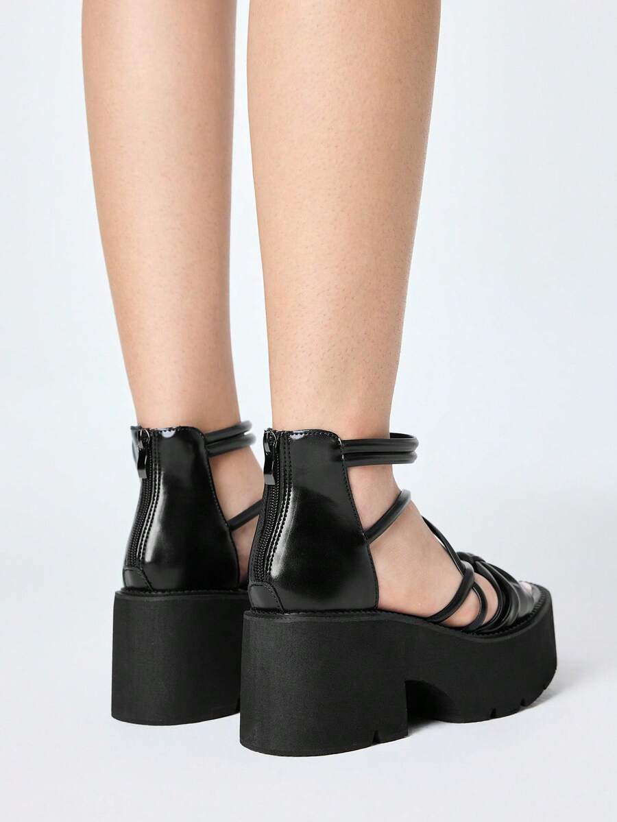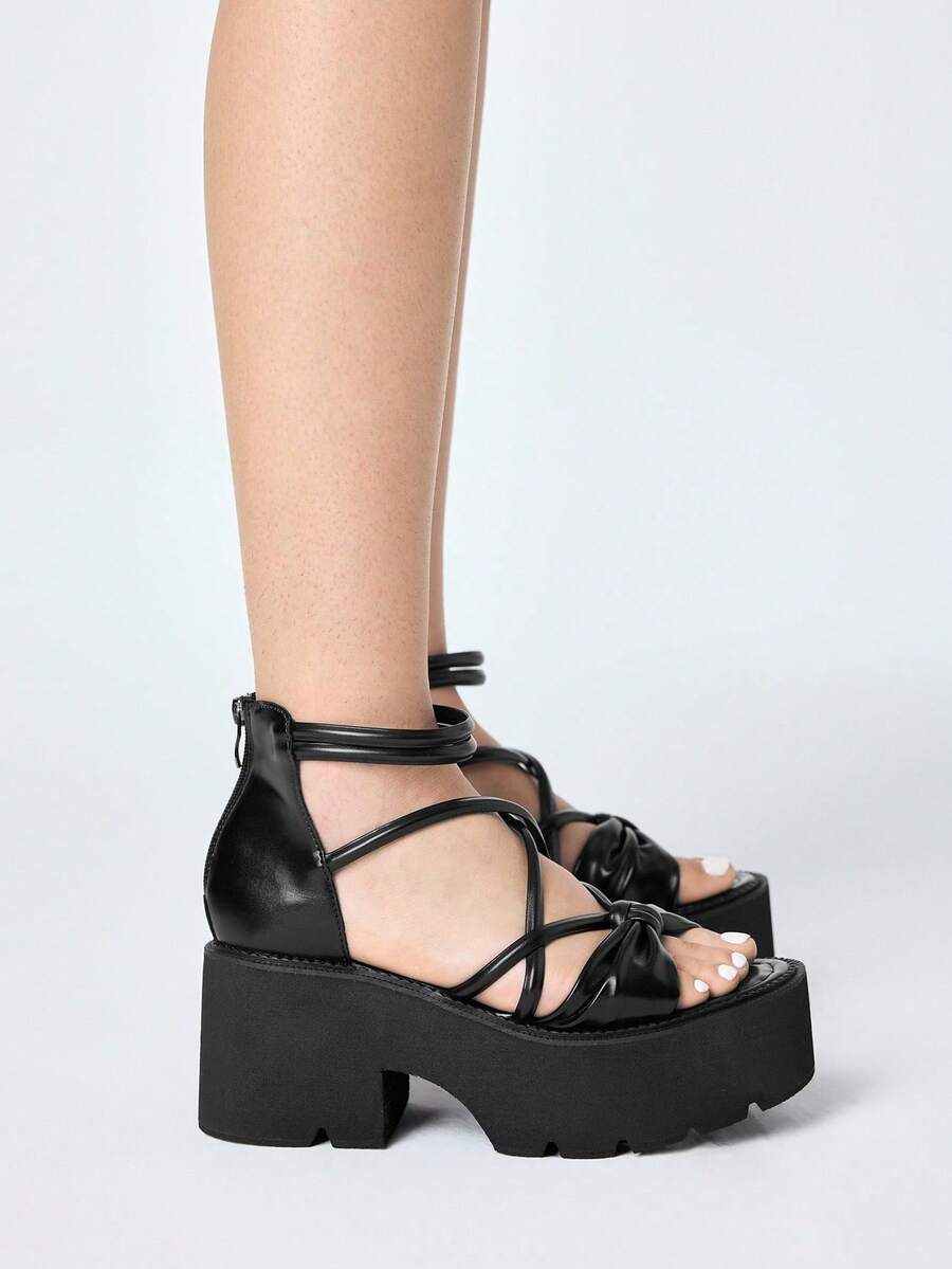 Women's Black Punk Gothic Style Platform Sandals, Retro Roman Criss-Cross Straps Peep Toe Thick Heel High Heels