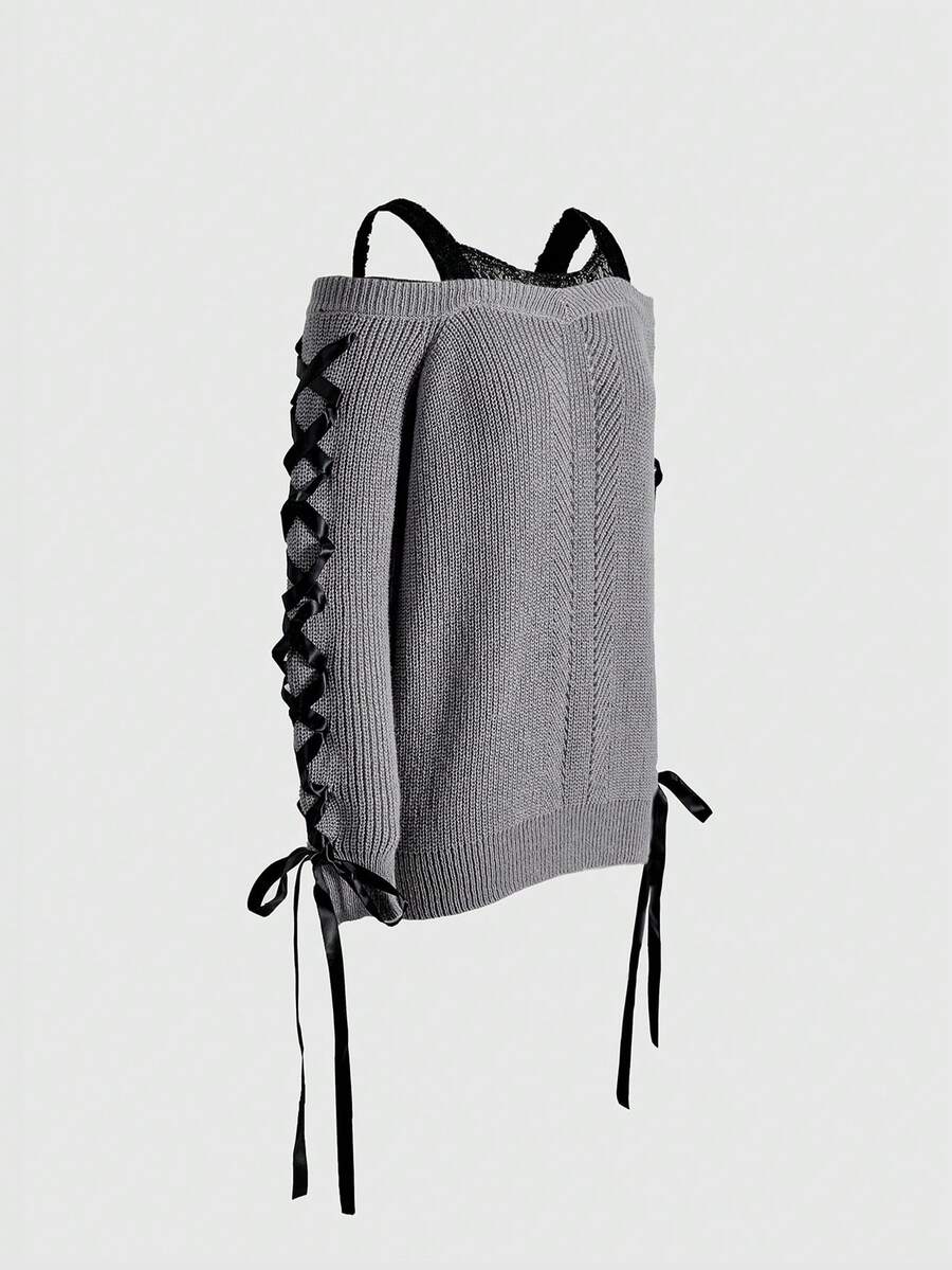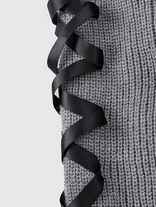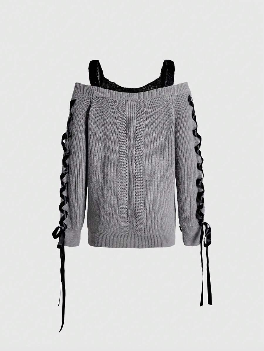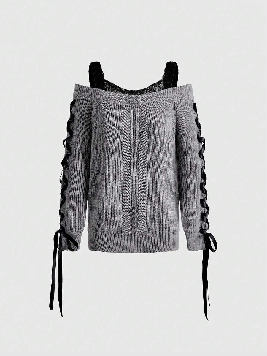 Women's Off-Shoulder Contrast Lace Side Ribbon Drawstring Sweater