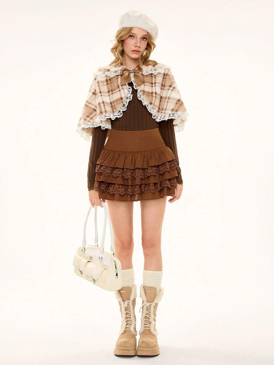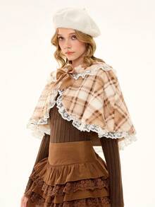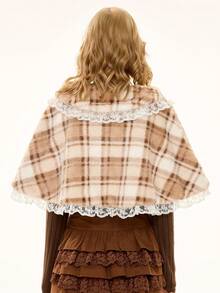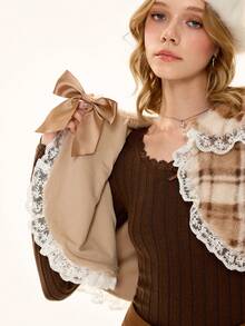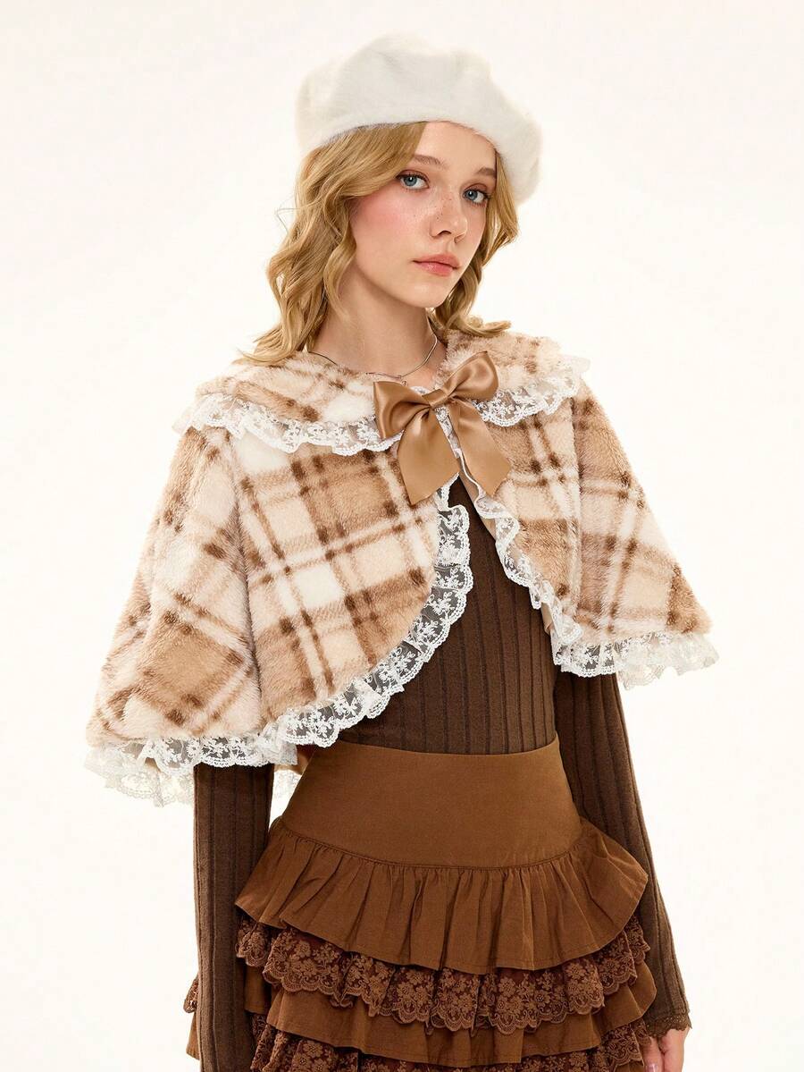 Women's Retro Fairycore Lace Patchwork Bow Plaid Fuzzy Fabric Cute Poncho Jacket