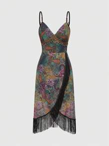 Women's Retro Hippie Western Music Festival Sheer Wood Bead Fringe Hem Paisley Print Dress