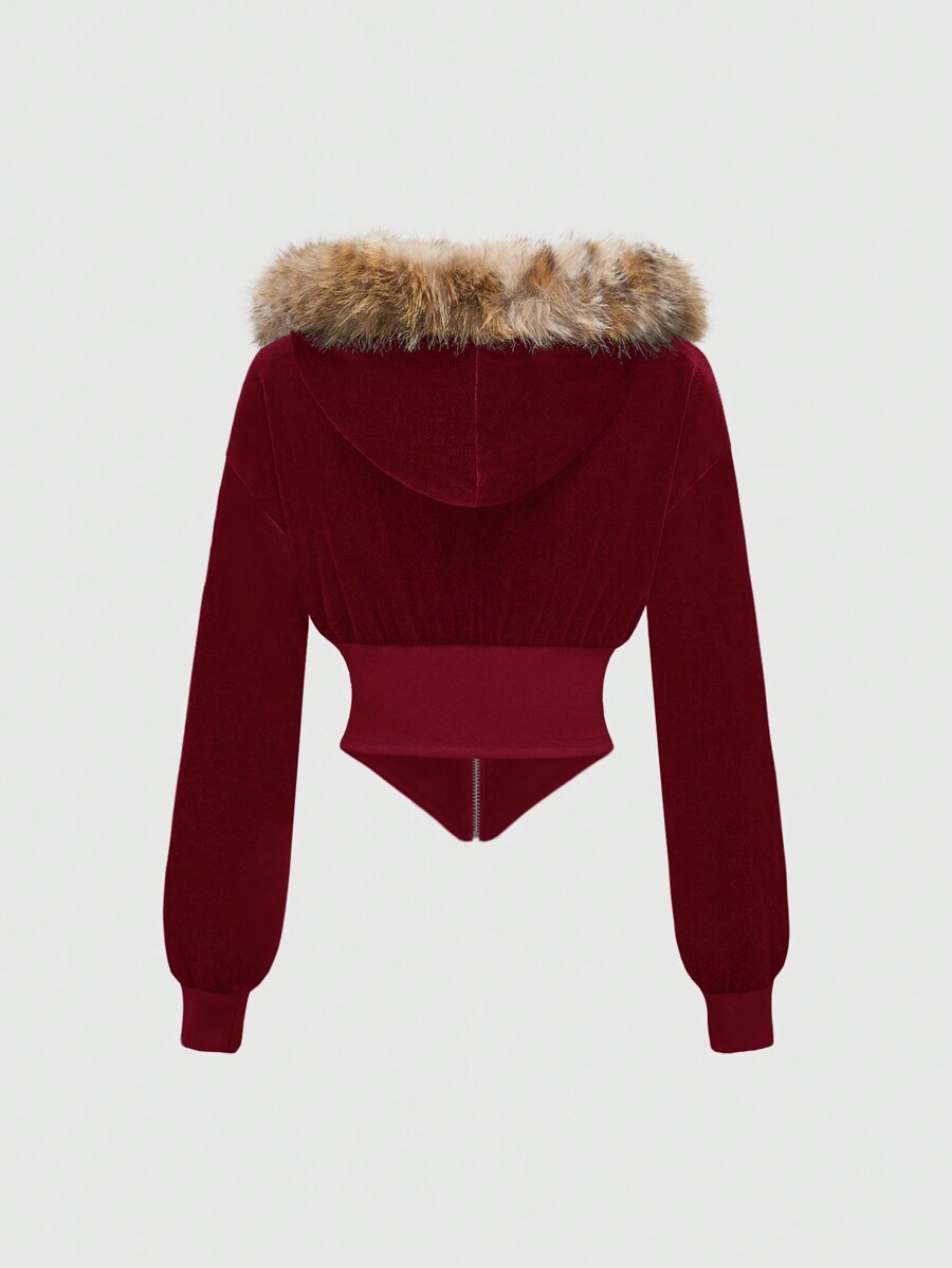 Women's Velvet Y2K Rhinestone Patchwork Hooded 2 Pieces Set With Fur Trim