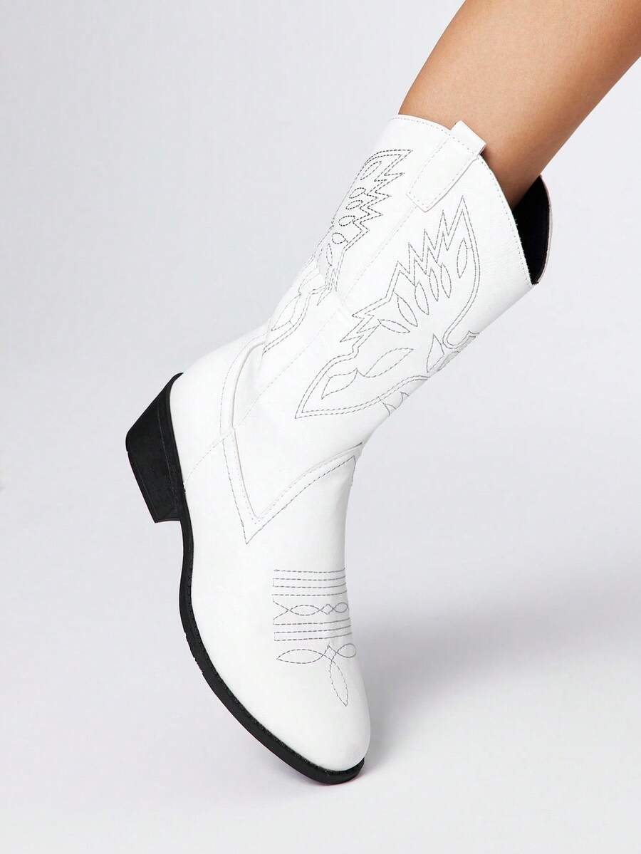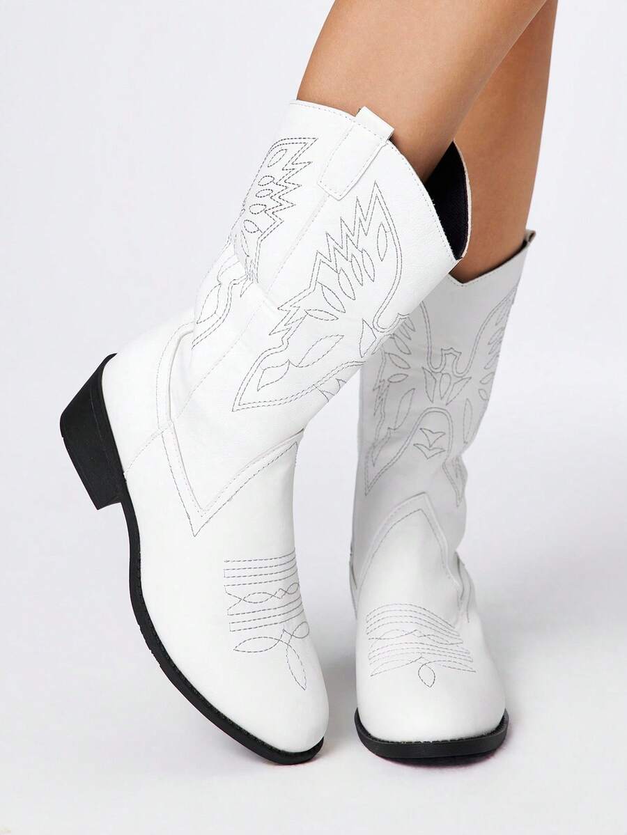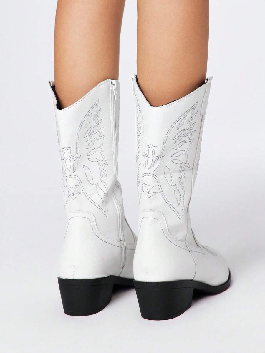 Women's White Western Embroidered Cowboy Knee-High Boots, Low Heel Leather Motorcycle Boots, Women's Ankle Boots And Short Boots