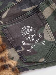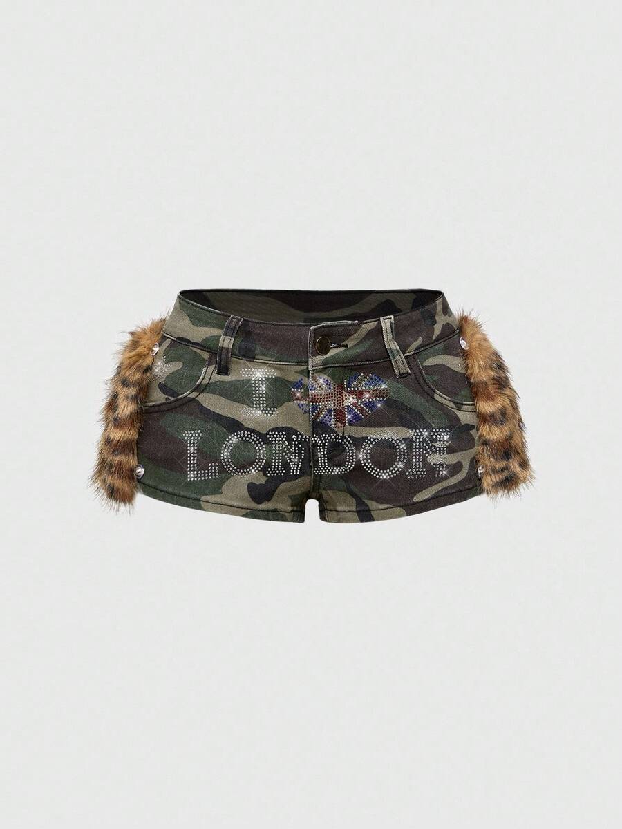 J-Fashion Y2K Baddie Patchwork Camo, Star, Rhinestone Decor Super Low Waist Denim Shorts