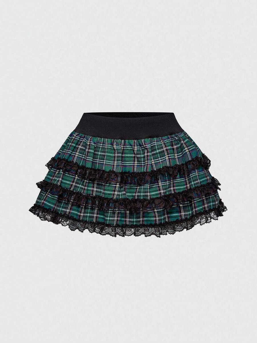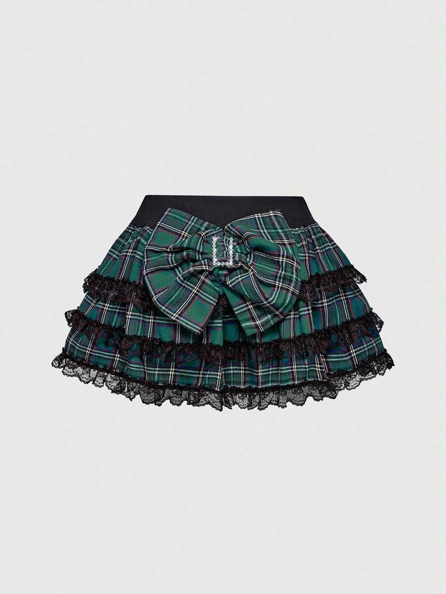 J-Fashion Y2K Harajuku Style Oversized Bow Low Waist Lace Trim Plaid Skater Skirt For Women
