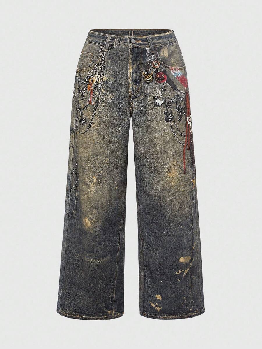 Grunge Punk Y2K Metallic Punk Vintage Chain Faux Print Women Low Waist Jeans