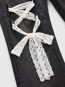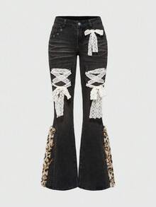 EDITION Y2K Romantic Punk Handmade Lace Patchwork Bowknot Strap Leopard Faux Fur Super Low Waist Women Flare Jeans