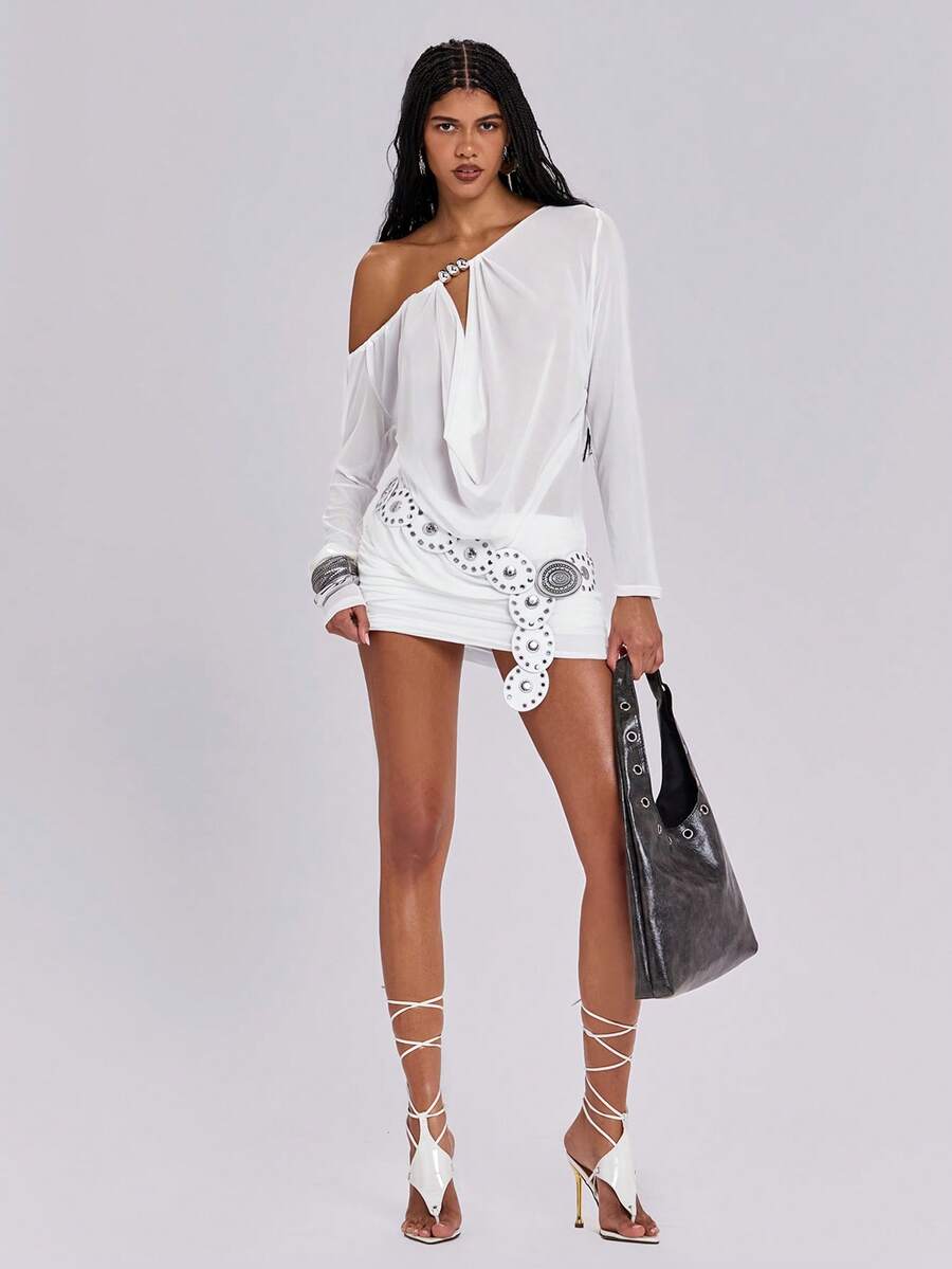 Y2K Spring/Summer Personalized Forward Sexy Metal Beaded Loose Relaxed Sheer Plunging Neck Women Top