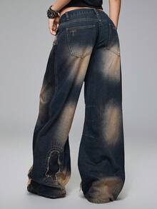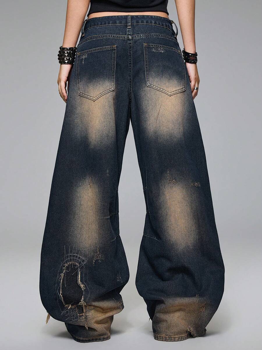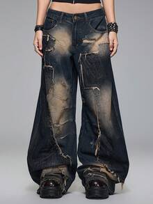 Grunge Punk Y2K Vintage Distressed Patchwork Washed Dark Blue Super Low Waist Baggy Jeans