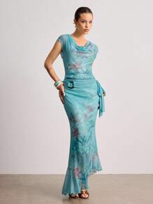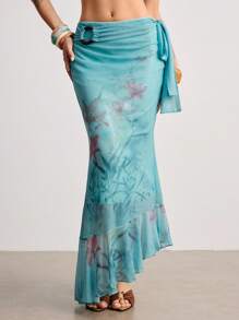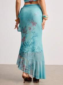 ROMWE Avant Y2K Vintage Floral Print Mesh Overlay Sequin & Bead Embellished Mermaid Skirt