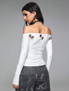 Grunge Punk Y2K Vintage Sexy Asymmetric-Shoulder Long Sleeve Perforated Fitted T-Shirt