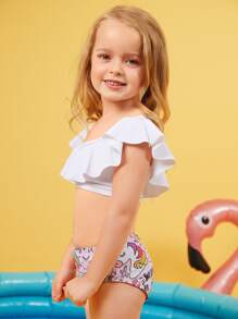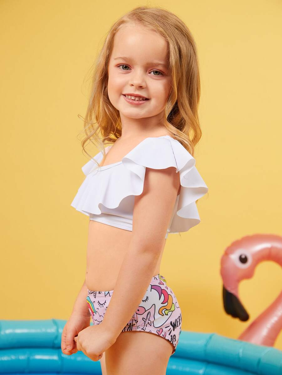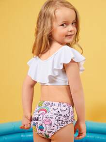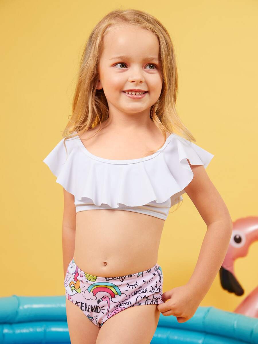 Young Girl Cartoon Graphic Ruffle Bikini Set Summer Beach