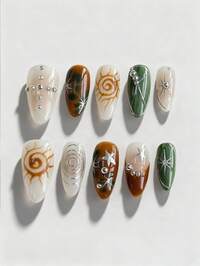 Fairycore 10pcs Fall Star & Moon Hand-Painted False Nails + 3pcs Double-Sided Adhesive, Removable Manicure Stickers, High Gloss Colorful Nail Art, Fit For Holiday Party, Dance & Daily Wear