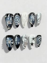 Kawaii 10pcs Halloween Punk Style Star Fake Press On Nails With 3pcs Double-Sided Adhesive, Removable Y2K Silver Hand Painted Nail Stickers, High-Quality Chain Bead Nail Decoration, Suitable For Festivals, Parties, Dancing And Daily Wear