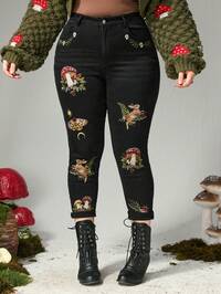 Plus Size Women Fairycore Mushroom, Plant & Flower Embroidered Denim Jeans, Autumn/Winter Plus Size Ladies Jeans