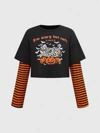Halloween Pumpkin Skull Graphic Striped Contrast Color Casual Women Long Sleeve T-Shirt