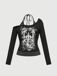 Grunge Punk Gyaru Summer Beach West Concert Women Raves Festival Streetwear Sexy Y2K 2 In 1 Asymmetric Shoulder Striped Contrast Color Vine Print Spade Halter Bowknot Women T-Shirt