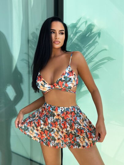 J-Fashion Y2K Retro Stylish Women 2 Pieces Set: Sheer Leopard & Floral Print Bikini Top And Mini Skirt, Beach Vacation Outfit