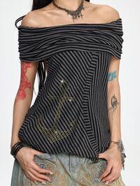 Grunge Punk Punk Sexy Y2K Striped Rivet Cross Off-Shoulder Fitted Long Sleeve T-Shirt For Women