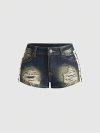 Grunge Punk Spring / Summer Vintage Washed Y2K Studded Decor Women Low Waist Mini Denim Shorts, Versatile For Various Occasions