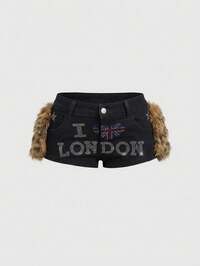 ROMWE Avant Y2K Baddie Flag & Star Rhinestone Patchwork Leopard Faux Fur Low-Rise Denim Shorts