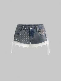 Grunge Punk Sexy Studded Lace Trim Patchwork Super Low Waist Mini Denim Shorts