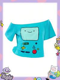 Adventure Time X ROMWE Off-Shoulder Funny Cartoon Print Women Short Sleeve T-Shirt